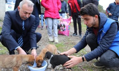 Belediye başkanı ve gönüllüler yavru köpekleri elleriyle besledi