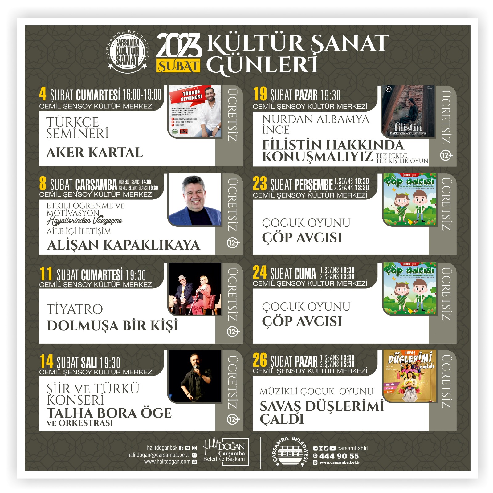 SAMSUN (AA) – Çarşamba Belediyesince şubat ayında gerçekleştirilecek kültür sanat etkinliklerinin programının belirlendiği bildirildi.