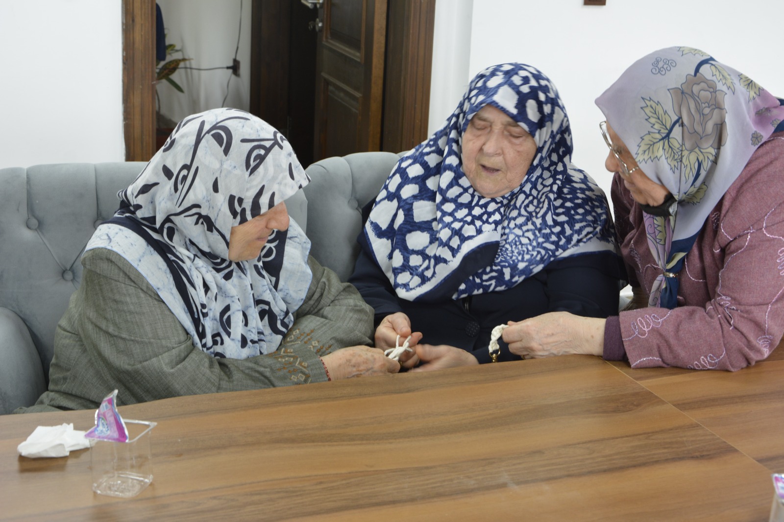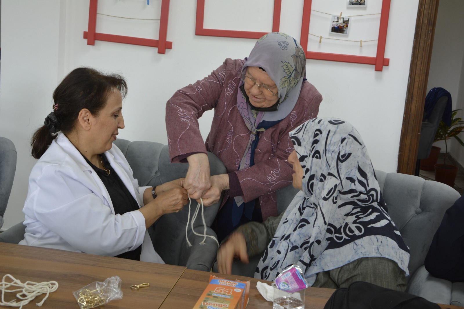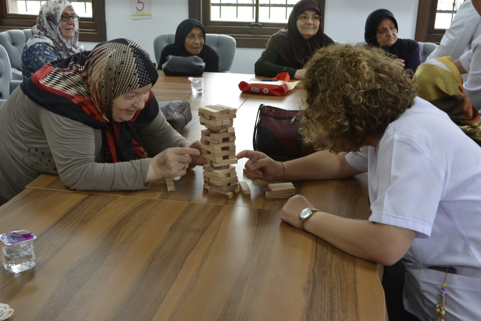 Etkinlikte yaşlılar birlikte mangala ve ahşap blok oyunu oynadı. Yaşlıların el becerilerinin gelişmesi için anahtarlık ve takı yapımı öğretiliyor.