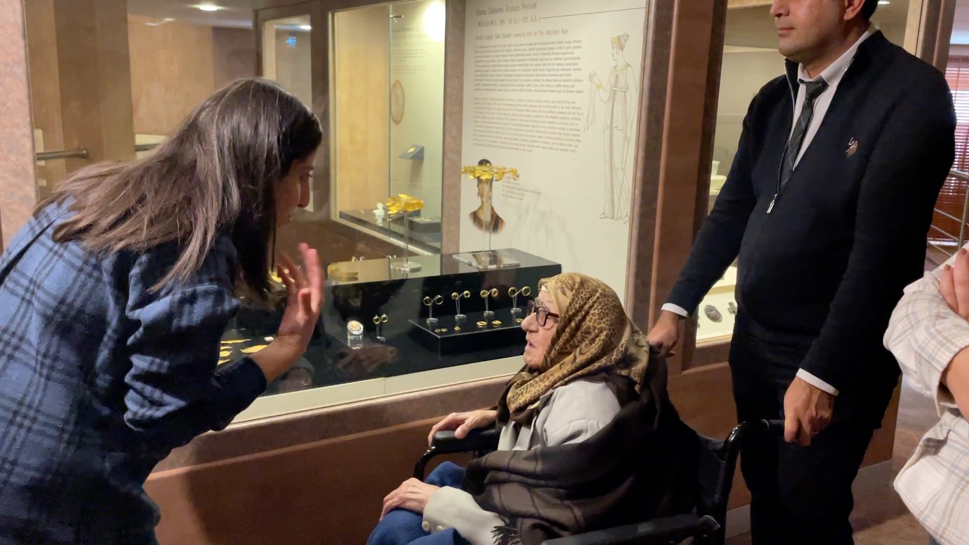 Beyrit, kızı Gülseren Ekiz ile tekerlekli sandalyeyle geldiği müzede sergilenen binlerce yıllık tarihi eserleri inceledi.
