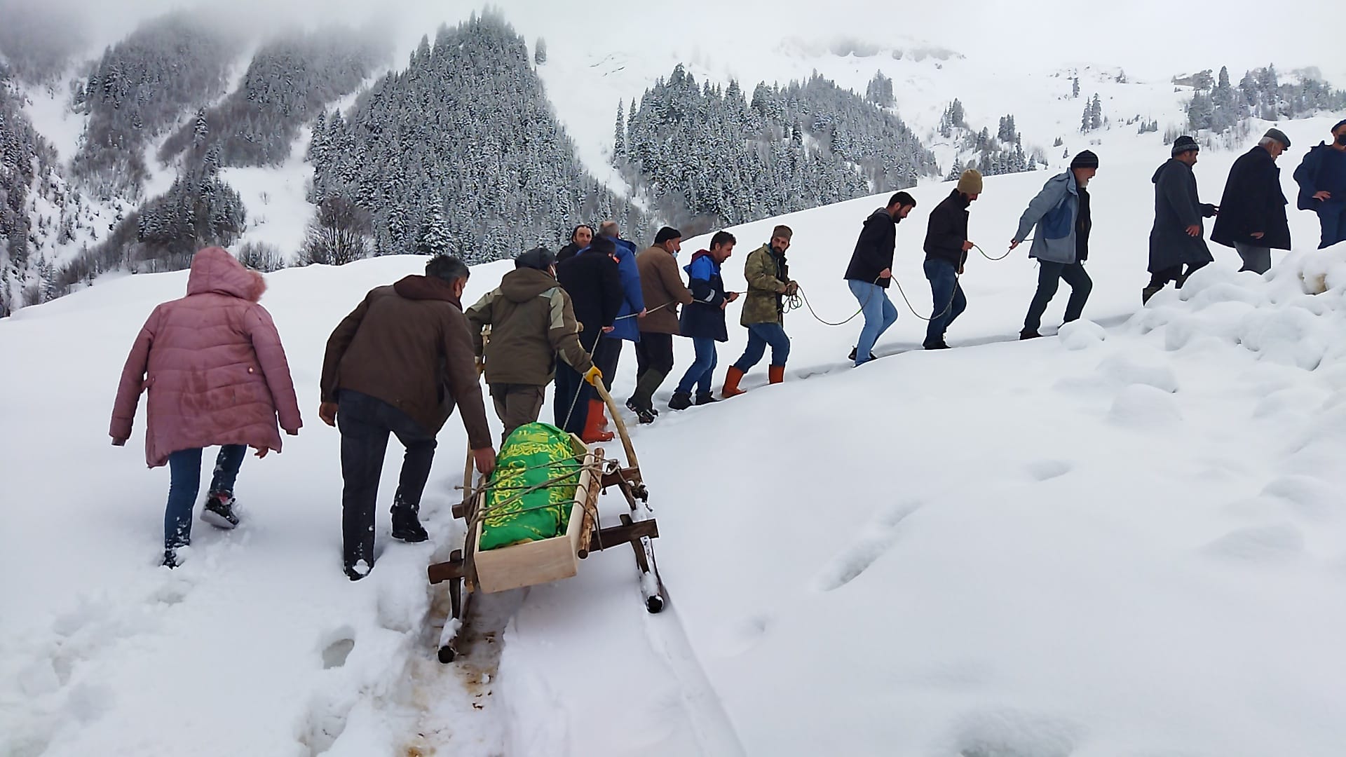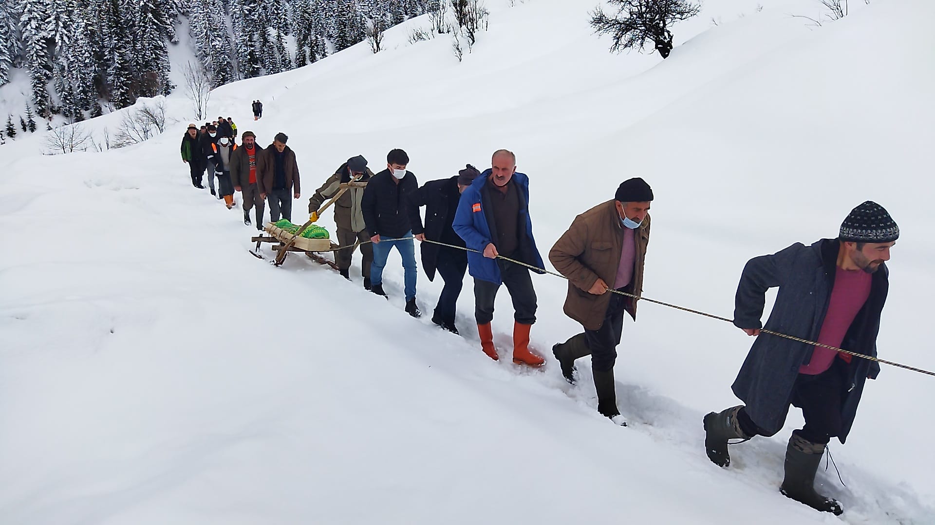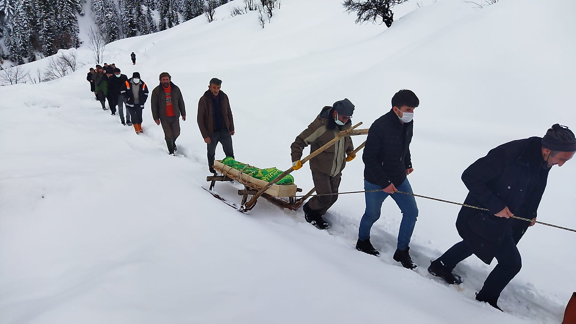 Artvin’de kardan yolu kapalı köydeki cenaze kızakla mezarlığa taşındı