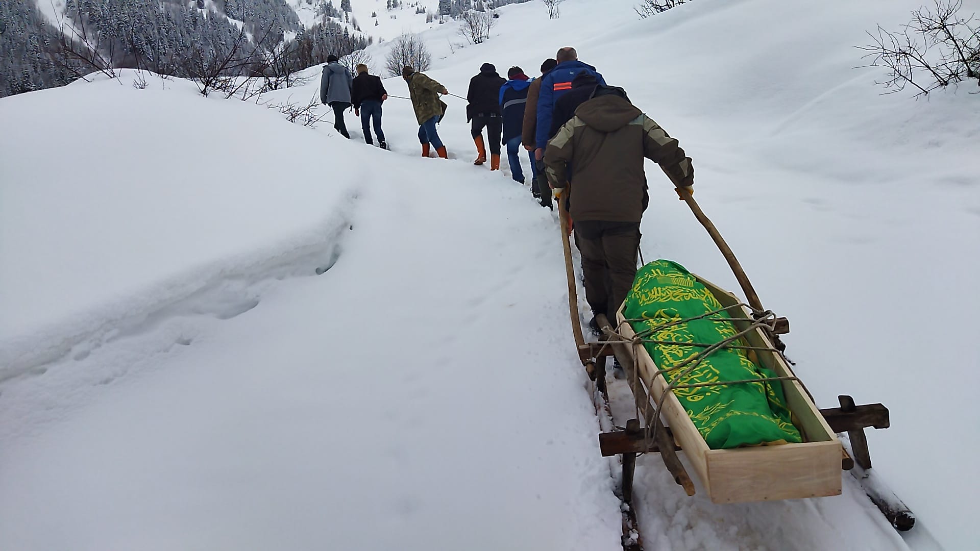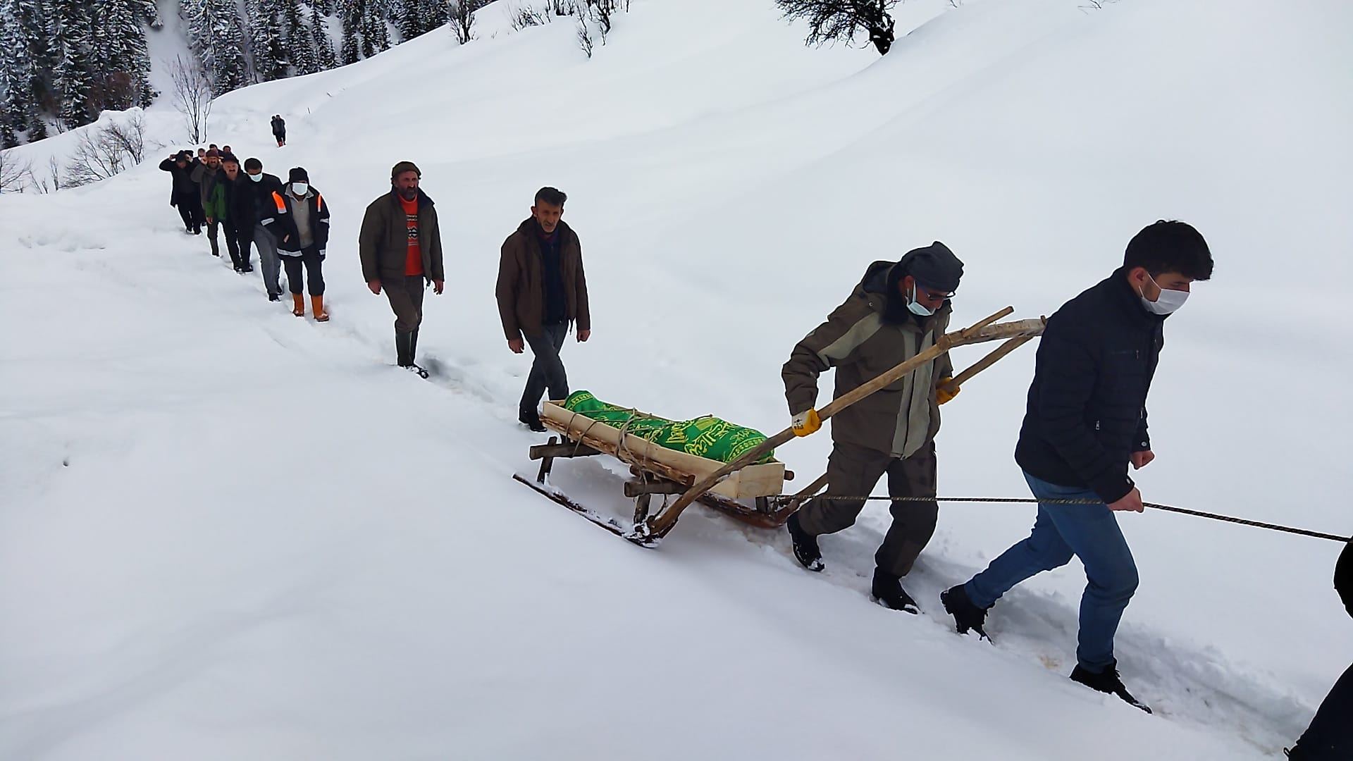 Bunun üzerine kızağa konulan cenaze, köy sakinlerince sırasıyla çekilerek yaklaşık 2 kilometre uzaklıktaki mezarlığına götürüldü.