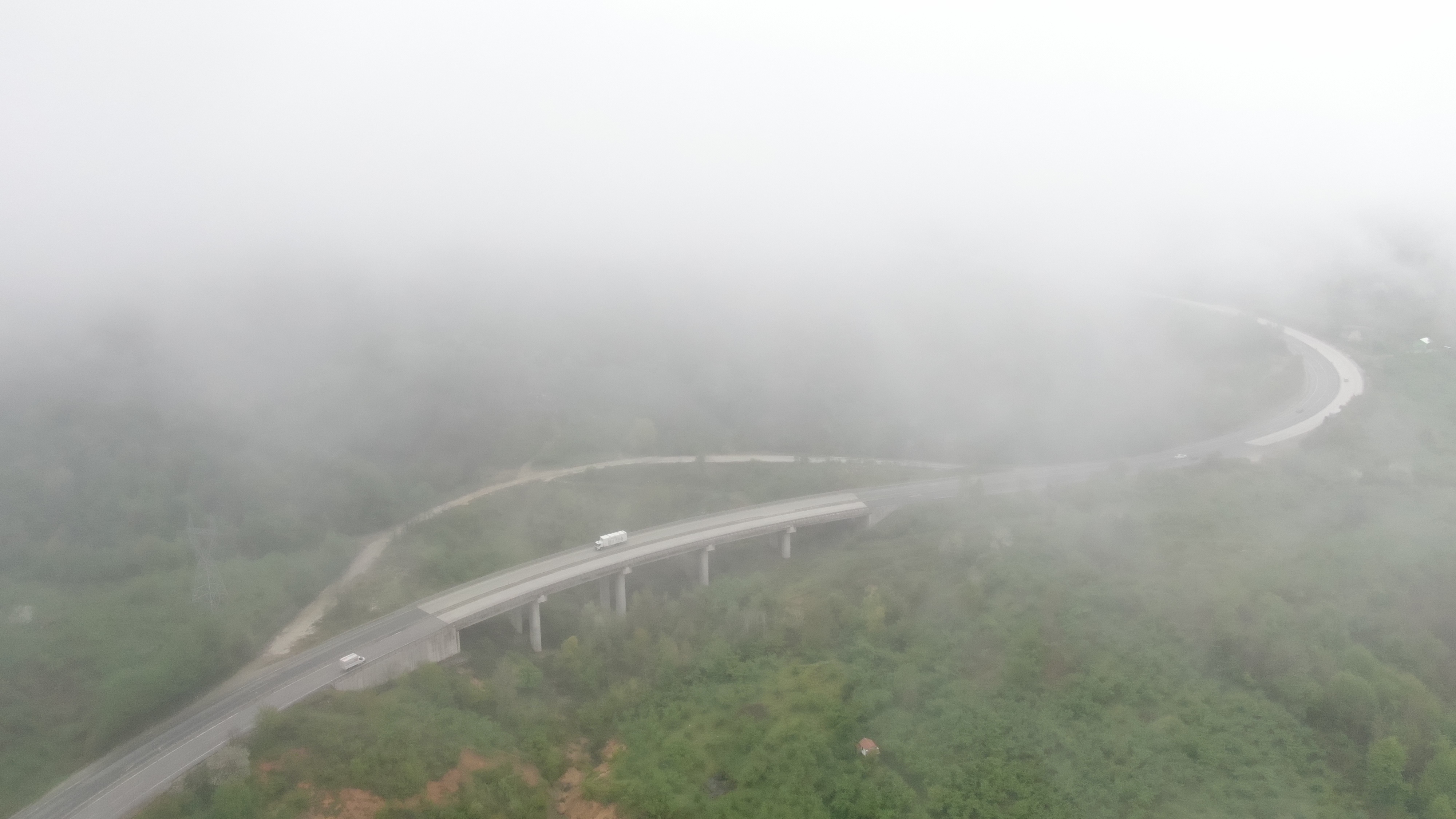 Dik rampaların yanı sıra keskin virajlar bulunan 34 kilometrelik D-655 Batı Karadeniz bağlantı yolunun Akçakoca kesiminde etkili olan sis, havadan görüntülendi.