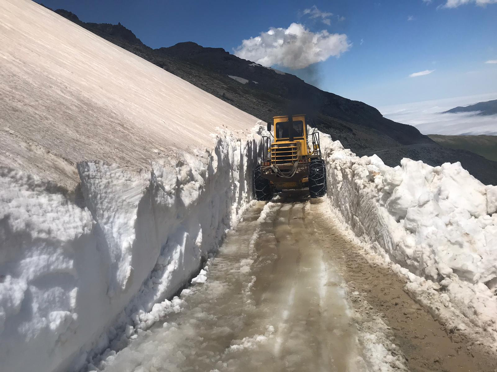 BAYBURT (AA) – Bayburt'ta haziranın son gününde yayla yollarında karla mücadele çalışması yapıldı.
