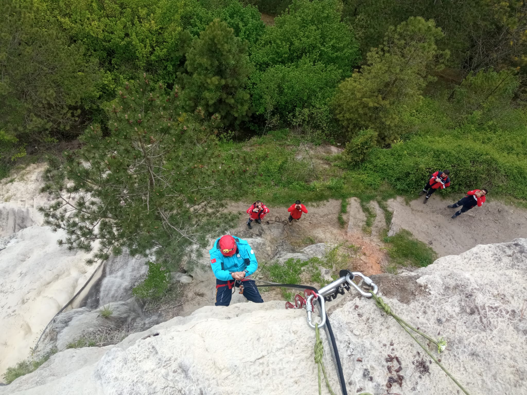 Eğitime katılan 22 UMKE personeli, kurulan dağcılık istasyonunda temel dağcılık ve yüksek yerlerde iniş ve tırmanış eğitimi aldı.