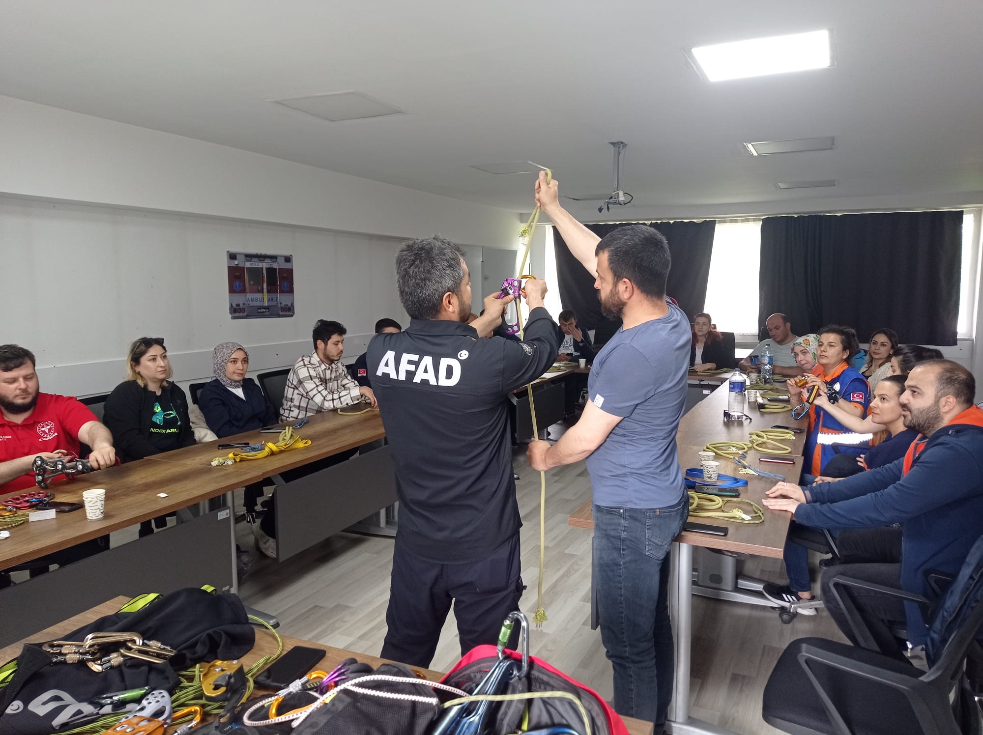 İl Afet ve Acil Durum Müdürlüğü (AFAD) personeli tarafından UMKE'nin Karaköy Mahallesi'nde bulunan deposunda gerçekleşen teorik eğitimde, dağcılıkla ilgili temel bilgiler verildi.