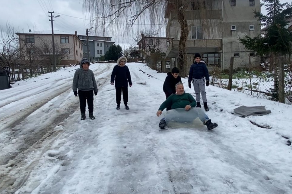 DÜZCE (AA) – Düzce'nin Akçakoca ilçesinde, çocukların karı temizlememesi talebine duyarsız kalmayan kepçe operatörü, onlarla birlikte kayarak eğlendi.
