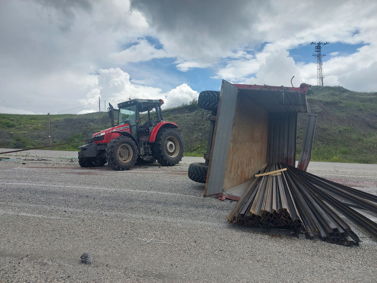 Devrilen traktörün kasasındaki demir profillerin yola saçılması nedeniyle Çorum-Yozgat kara yolunda ulaşımda aksama yaşandı.