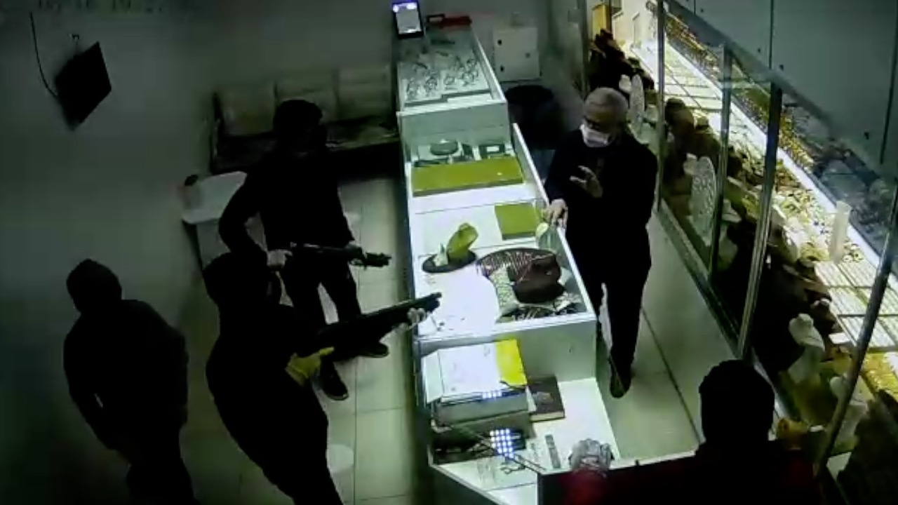 Bu arada zanlıların iş yeri sahibini pompalı tüfeklerle etkisiz hale getirip vitrinden altınları aldıkları anlar, iş yerinin güvenlik kamerasına yansıdı.