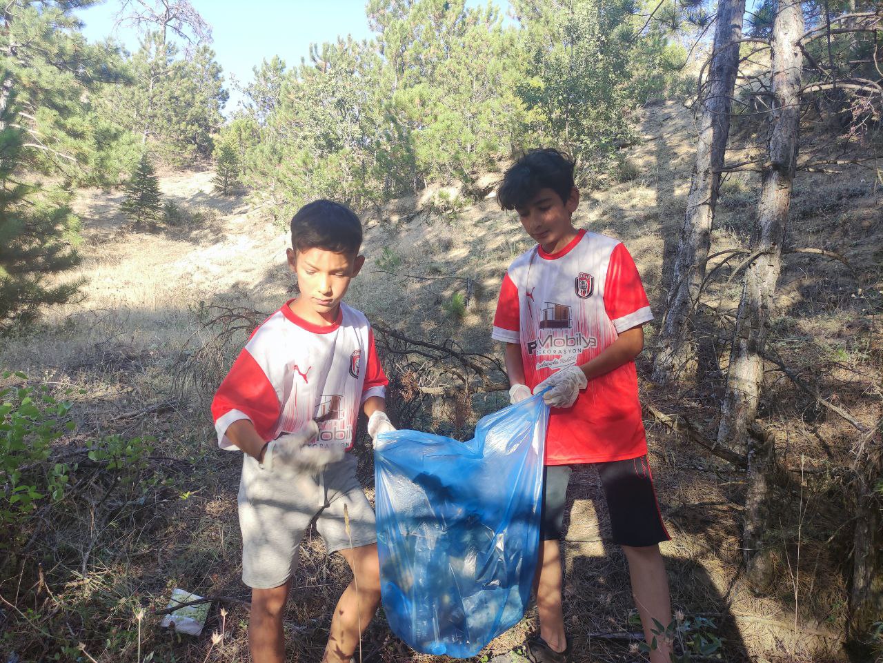 Çorum’da minik futbolcular ormanda antrenman sonrası çevre temizliği yaptı