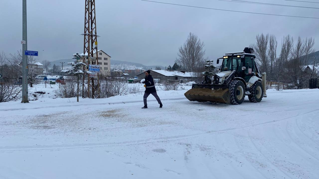 Hava sıcaklığının sıfırın altına düştüğü ilçede, belediye ekipleri yaklaşık 5 santimetreye ulaşan karı temizliyor.