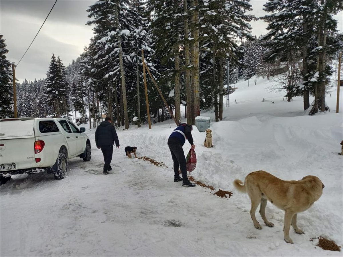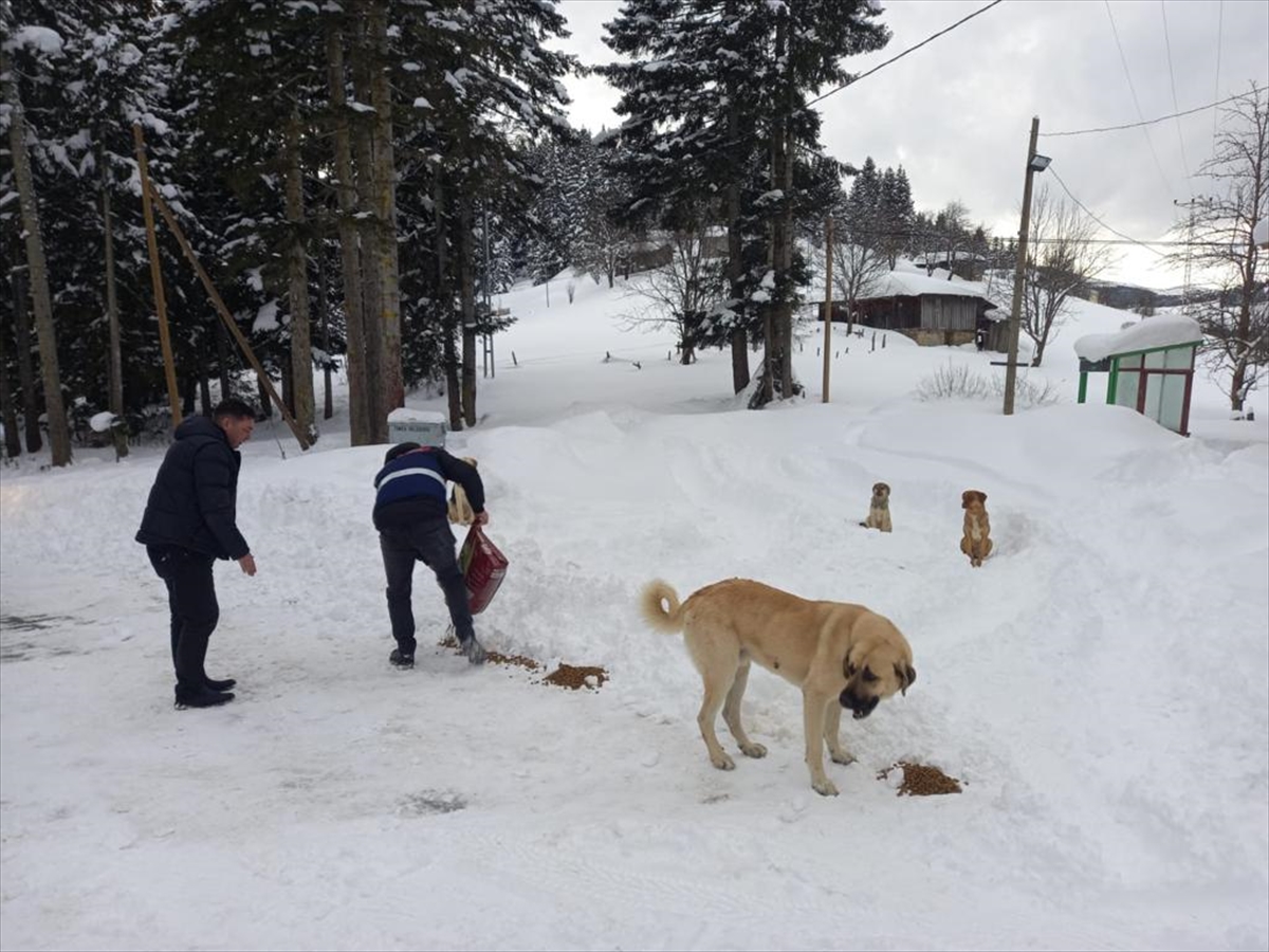 GÜMÜŞHANE (AA) – Gümüşhane'nin Kürtün ilçesinde jandarma ekipleri, kardan dolayı yaylada mahsur kalan sokak köpeklerini besledi.