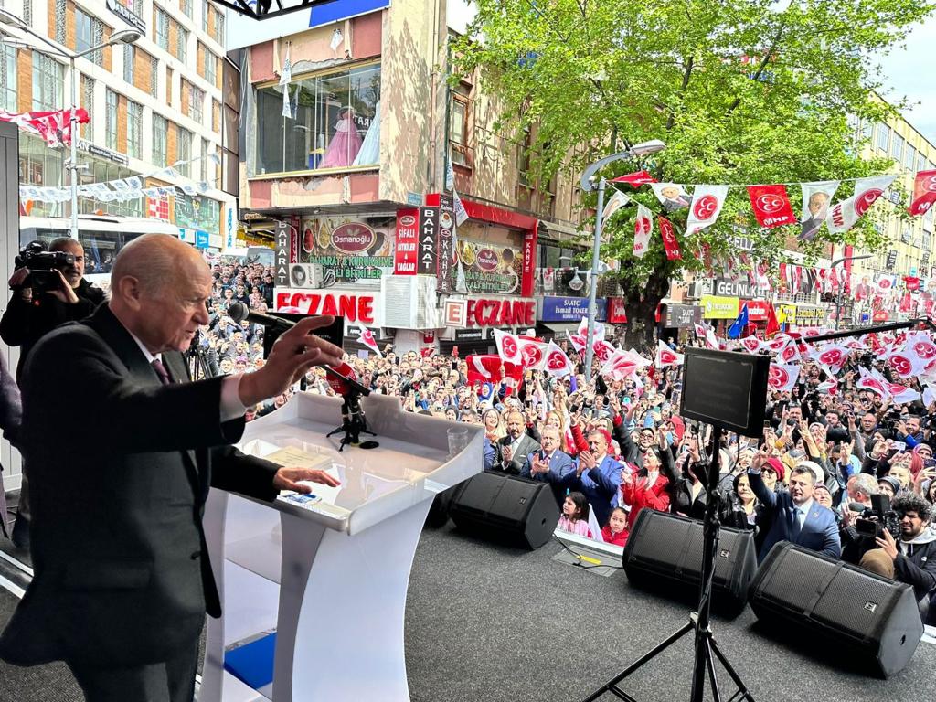 Partisinin Karabük Kemal Güneş Caddesi'nde düzenlediği “14 Mayıs'ta Aziz Milletim Sıra Sende” temalı açık hava toplantısında konuşan Bahçeli, Cumhurbaşkanlığı ve 28. Dönem Milletvekilliği Genel Seçimleri'nin ülkenin dirliğine, milletin birliğine, insanın huzur ve refahına hayırlı ve kalıcı sonuçlar getirmesini diledi.