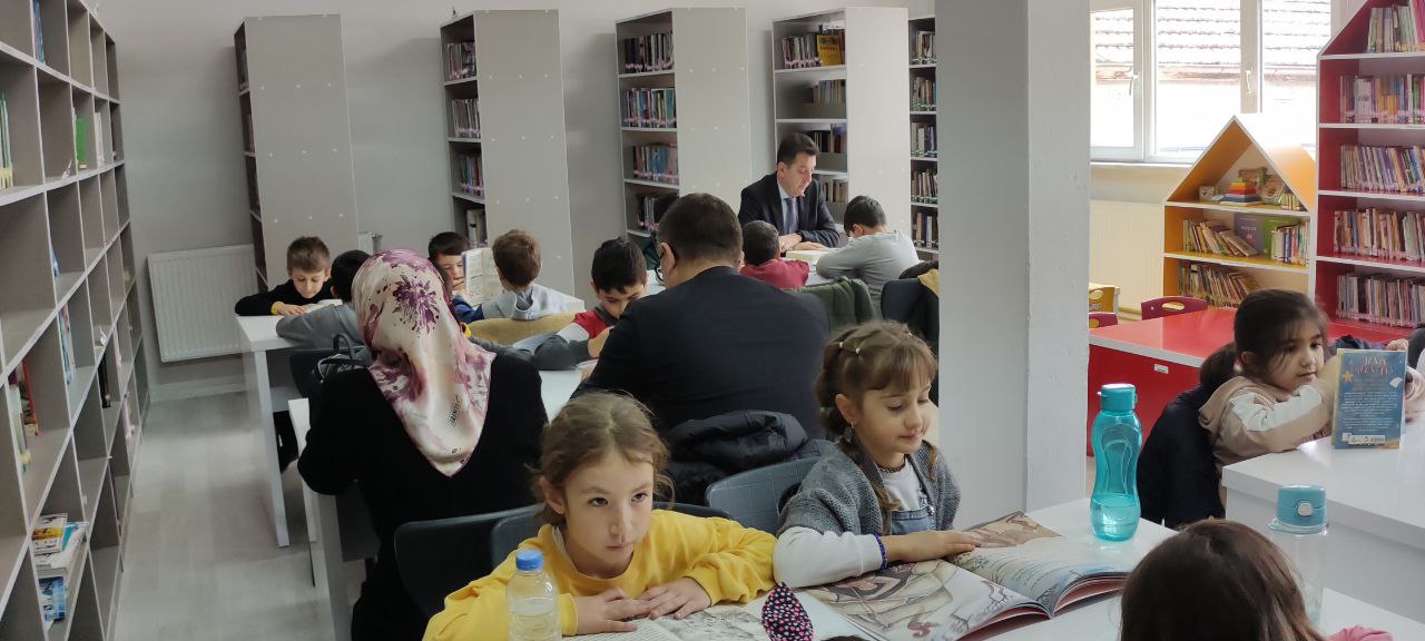 Proje kapsamında ilçedeki ilkokul öğrencileri, Oğuzlar Halk Kütüphanesi'ne getiriliyor.