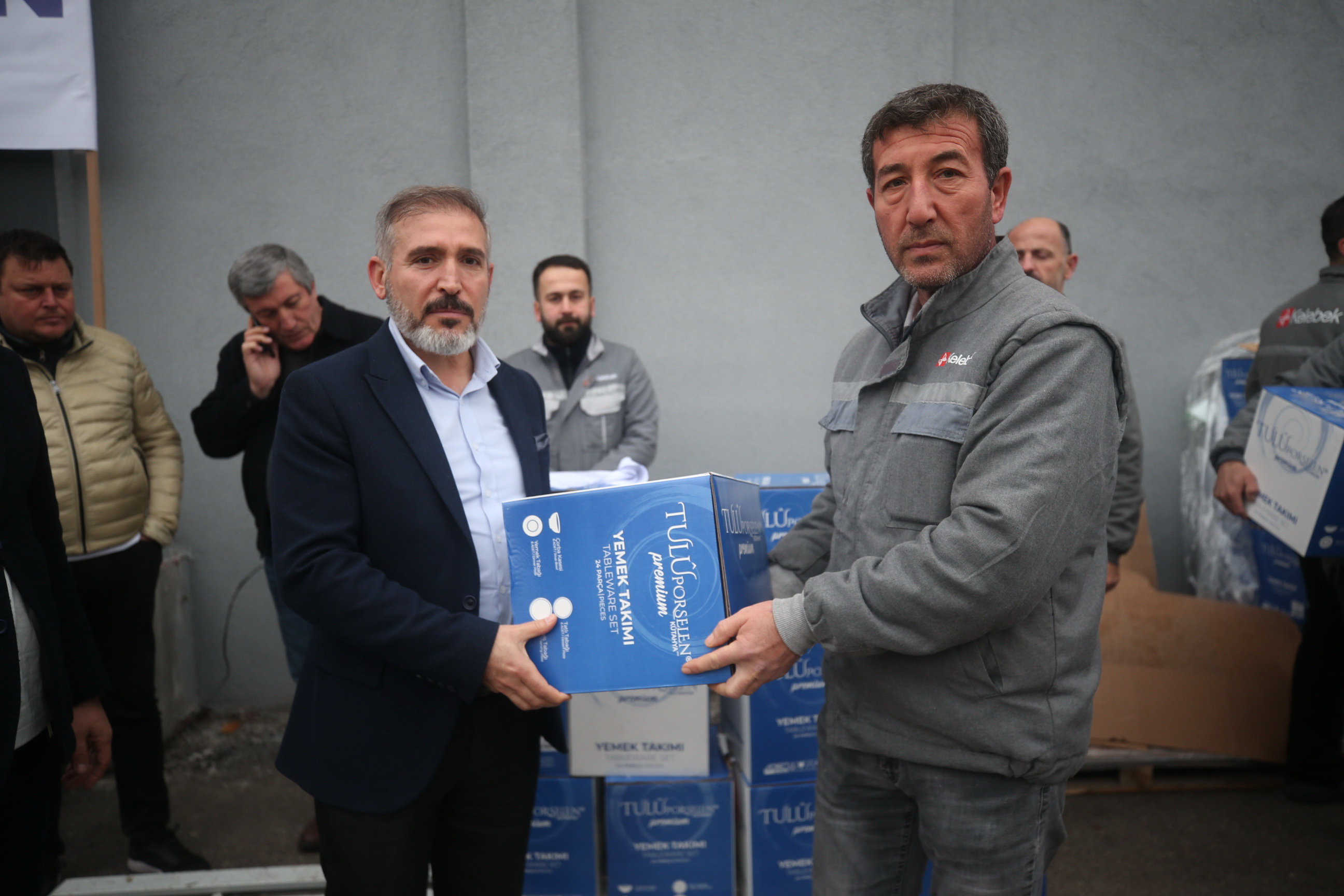 Fabrikada 550 üyelerinin olduğunu anımsatan Dolu, “Diğer çalışanları da ayırmadık, onları da ekledik. Toplamda 750 kişiye dağıtım yaptık. 400 bin liralık malzeme dağıtıyoruz. Genelde mutfak eşyaları kırılmış ve dolaplar devrilmiş. Arkadaşlarımız bu konuda talepte bulundular. Biz de katkı olması açısından mutfak malzemeleri dağıtıyoruz.” diye konuştu.