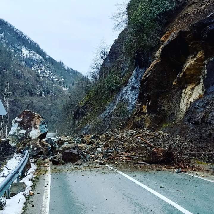 Alınan bilgiye göre, Hemşin ilçesine bağlı Taşköprü mevkisinde sabah saatlerinde yamaçtan kopan kaya parçaları Pazar-Hemşin kara yoluna düştü.