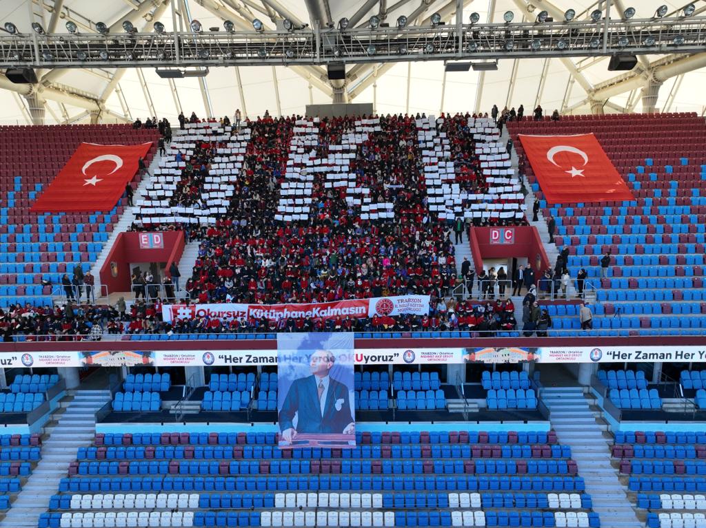 Trabzonspor forması giyen öğrenciler “Oku” yazan koreografi gösterisi yaptı, ayrıca “Okursuz kütüphane kalmasın” yazılı pankart da açtı.