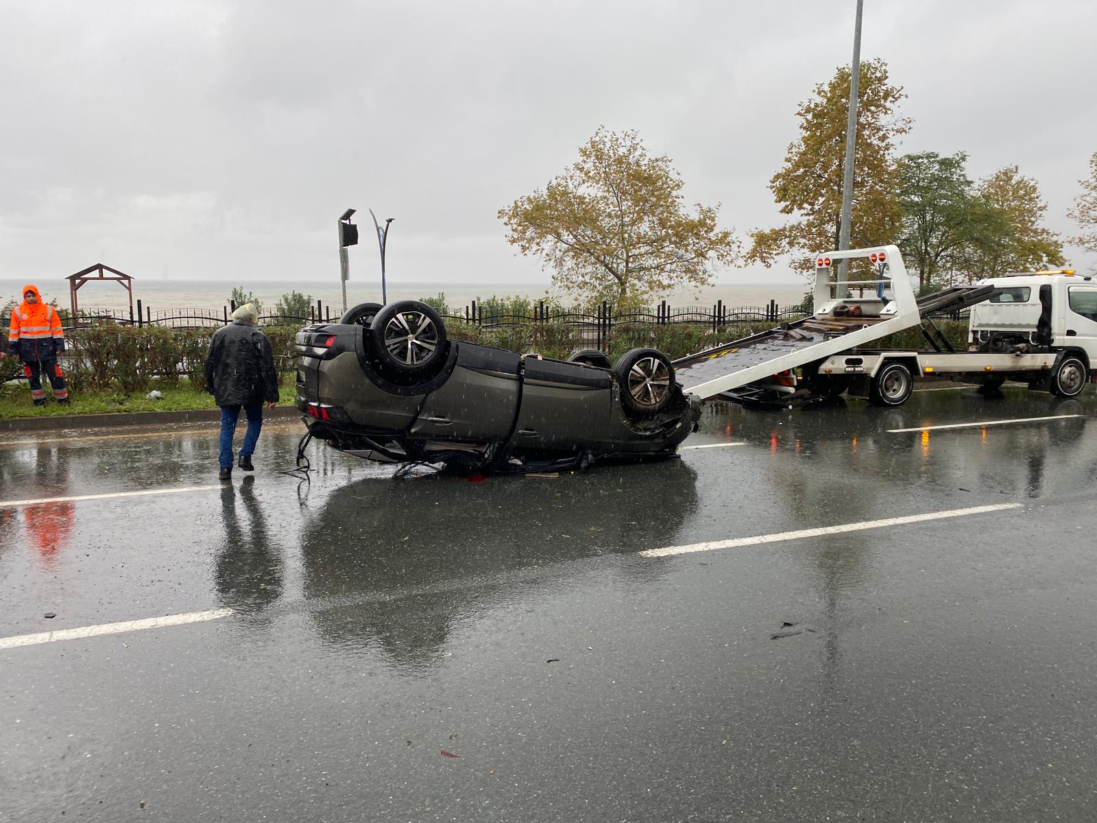 Trabzon'dan Of ilçesi istikametine giden Emin Tuğcu yönetimindeki 61 ACP 873 plakalı otomobil, Sürmene sahil geçişinde, yağmur nedeniyle kayganlaşan yolda refüje çıktı.