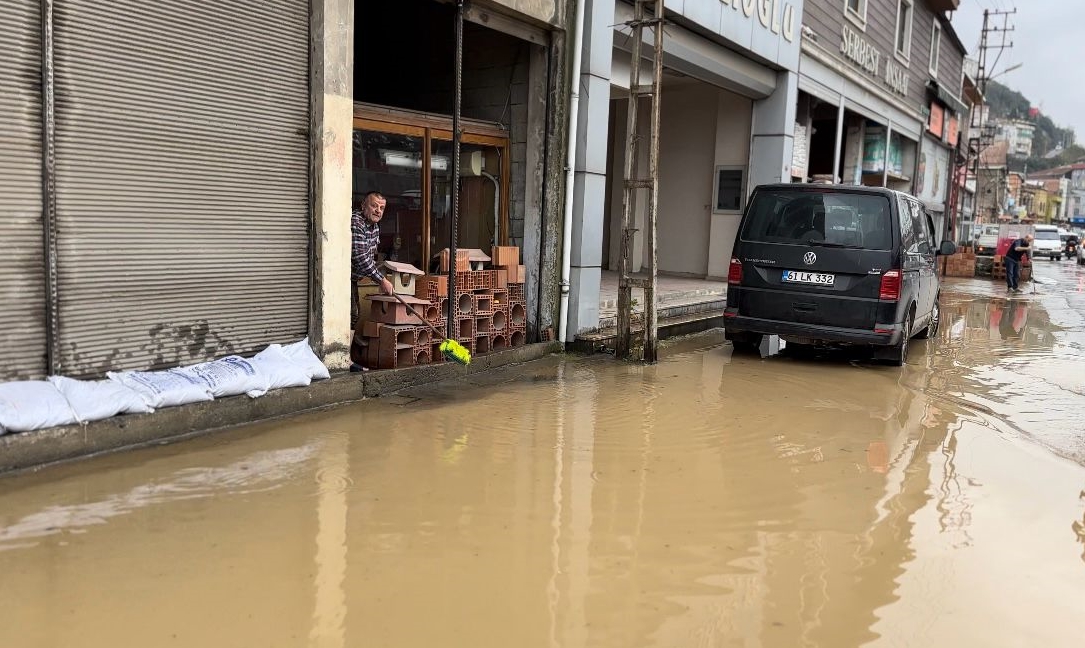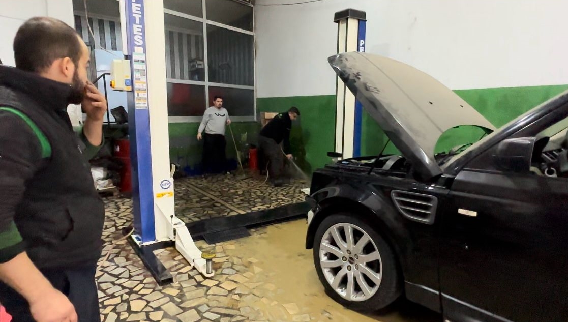 Bölgede bulunan bazı iş yerlerini su bastı, dükkanların önündeki eşyalar ve malzemeler de sürüklendi.