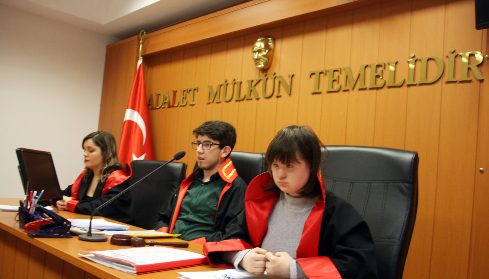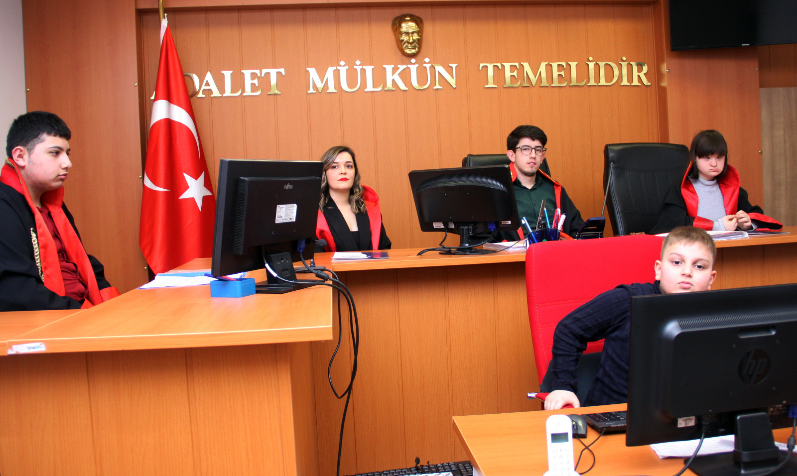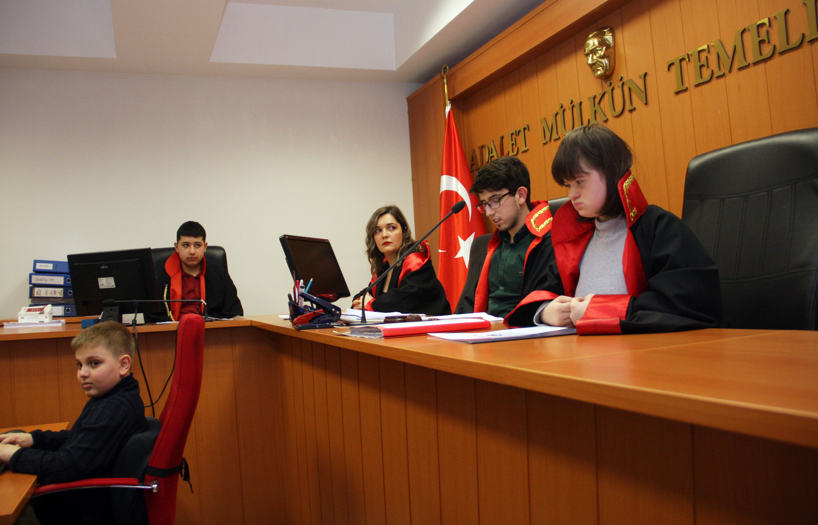 Daha sonra çocuklar için temsili olarak hazırlanan duruşma salonunda, hakim, cumhuriyet savcısı, avukat, zabıt katibi, mübaşir ve tanık özel çocuklardan oluştu.