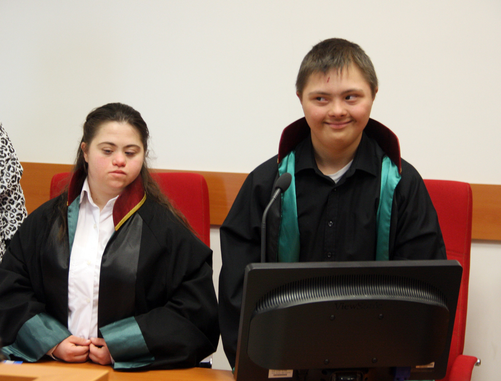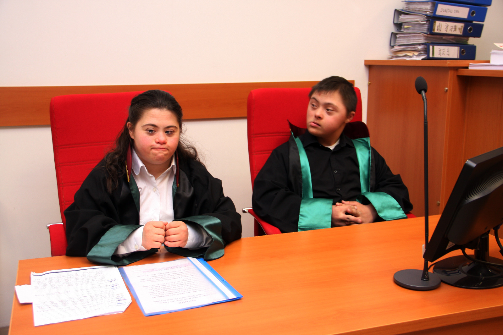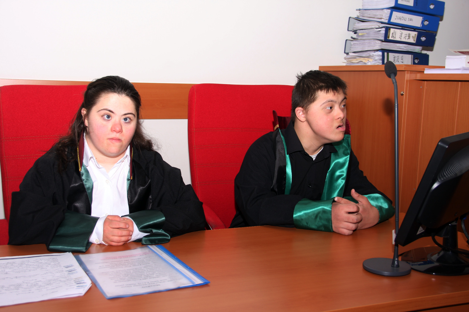 Daha sonra çocuklar için temsili olarak hazırlanan duruşma salonunda, hakim, cumhuriyet savcısı, avukat, zabıt katibi, mübaşir ve tanık özel çocuklardan oluştu.