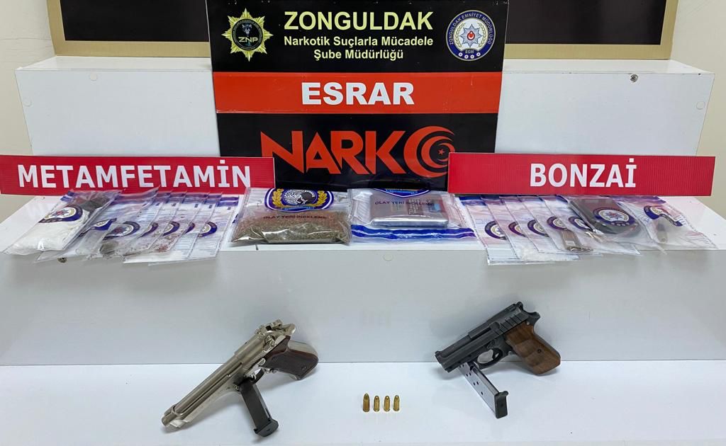 Bir miktar uyuşturucu ve uyarıcı madde, 2 tabanca, 4 fişek, 2 uyuşturucu kullanma aparatı, 2 hassas terazi ele geçirilen operasyonda, 3 zanlı gözaltına alındı.